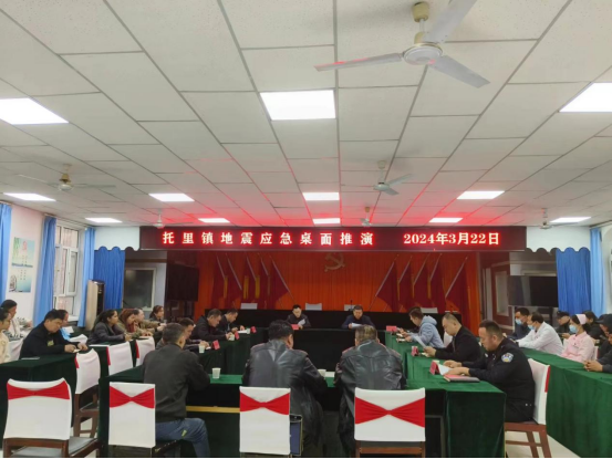 2024年3月22日上午11时,托里镇召集镇抗震救灾指挥部成员单位,驻场水电暧油气通讯学校医院等单位,开展地震应急桌面推演。模拟3月22日上午11时,县境内发生6.5级强震。震源深度10千米。距镇区15千米。受强地震影响,镇各地瞬间震感强烈,有房屋坍塌,村民受伤。