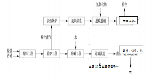①混料工段:生产所需原料芒硝和兰炭分别经破碎机破碎,筛分合格后分别计量后,按比例混合均匀后置于斗式提升机料斗中,然后连续加入转炉中;②转炉工段:转炉由新型旋风式直喷燃烧器提供热量,混合料连续投入转炉内在高温下进行还原反应。反应结束后制得的熔体黑灰从出炉口卸出。转炉的烟气经废热锅炉后经旋风除尘、脱硫脱硝、布袋除尘处理后高空排放。废热锅炉产生的低压蒸汽用于生产和生活用汽;③溶碱工段:本工段属物理过程,主要通过将黑灰加入水中,将其中的硫化钠组分溶解;④过滤洗泥、蒸发、包装工段:本工段主要通过过滤系统去除泥渣,获得溶解后的清碱液;清碱液送入蒸发装置,获得干燥后固体,固体经过包装获得成品。部分成品外售,部分成品直接输送至二硫车间作为二甲基二硫原料。
