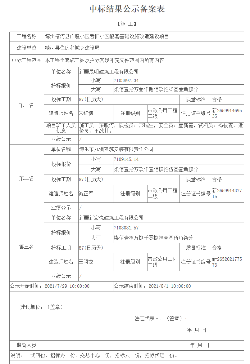 博州精河县广厦小区老旧小区配套基础设施改造建设项目中标结果公示
