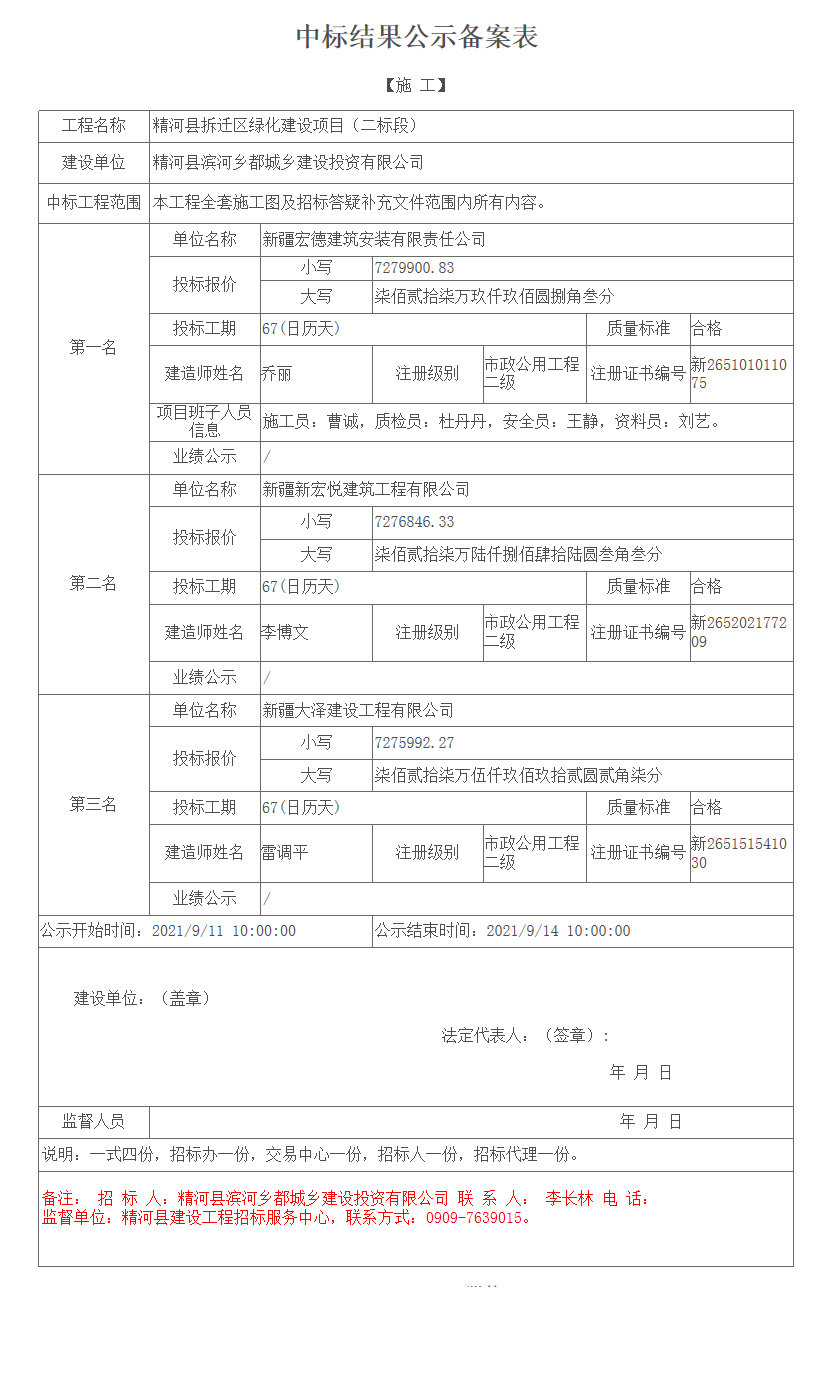 精河县拆迁区绿化建设项目(二标段)中标结果