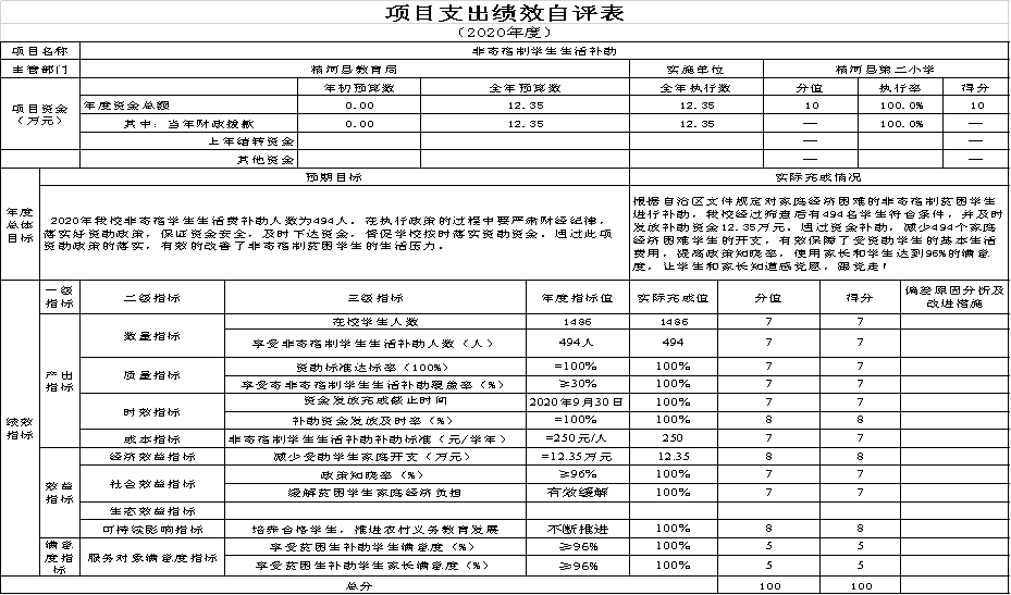 预算绩效管理取得的成效:一是初步树立绩效理念。通过开展绩效评价,我单位领导开始转变观念,重视财政支出绩效问题,由重资金争取重过程管理,向重支出责任,重产出和结果转变,以提高资金使用绩效为目标,以结果为导向的管理理念正在逐步形成;二是强化了责任意识。通过设立明确可衡量的绩效目标,单位各部门更清楚的了解项目资金所要取得的社会和经济效益,使各部门的职能和目标得到进一步明确,在一定程度上强化了单位整体和各部门的自我约束意识和责任意识;三是增强了资金管理的科学性,对预算资金支出的科学性、效益性和管理水平的评价,对绩效评价结果的运用,有利于促进各部门不断完善内部管理,自觉加强对各项预算资金的管理和监督,不断增强财政资金使用、管理的科学性。四是财政部门足额拨付义教经费,确保单位正常运转,单位业务工作正常开展。保证学生受教育的权利,使少年在品德、智力、体质等方面全面发展,按照规定标准完成教育教学任务,提高教育教学质量,促进学生全面发展;加强安全和后勤服务工作,为提高教育教学质量提供有力保障。五是根据自治区文件规定对家庭经济困难的非寄宿制贫困学生进行补助,通过资金补助,减少494个家庭经济困难学生的开支,有效保障了受资助学生的基本生活费用,提高政策知晓率,使用家长和学生达到96%的满意度,让学生和家长知道感党恩,跟党走!