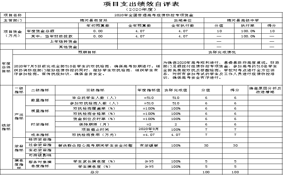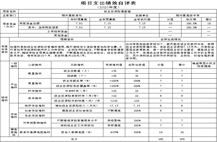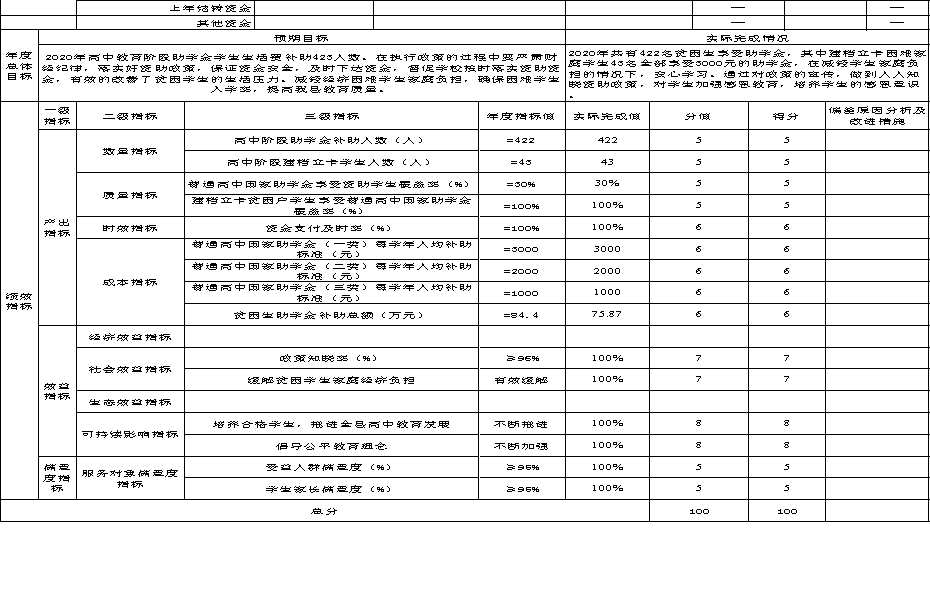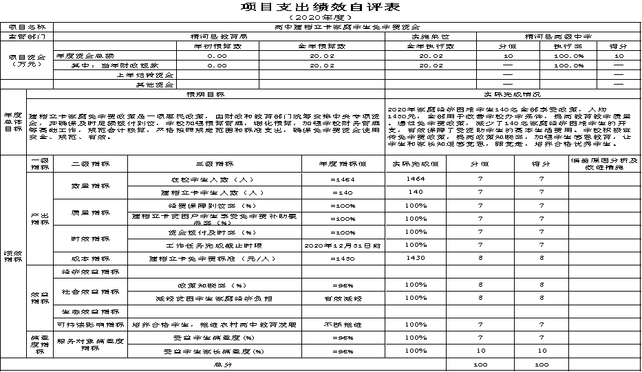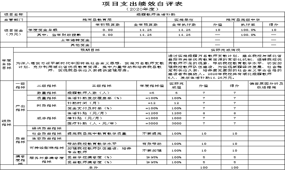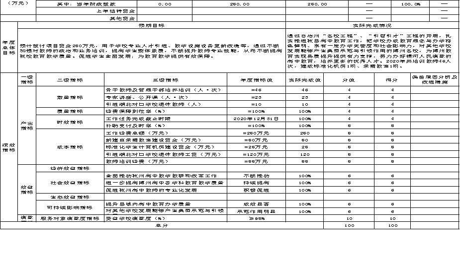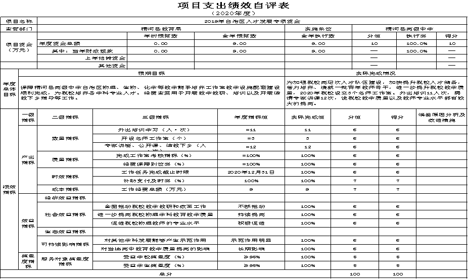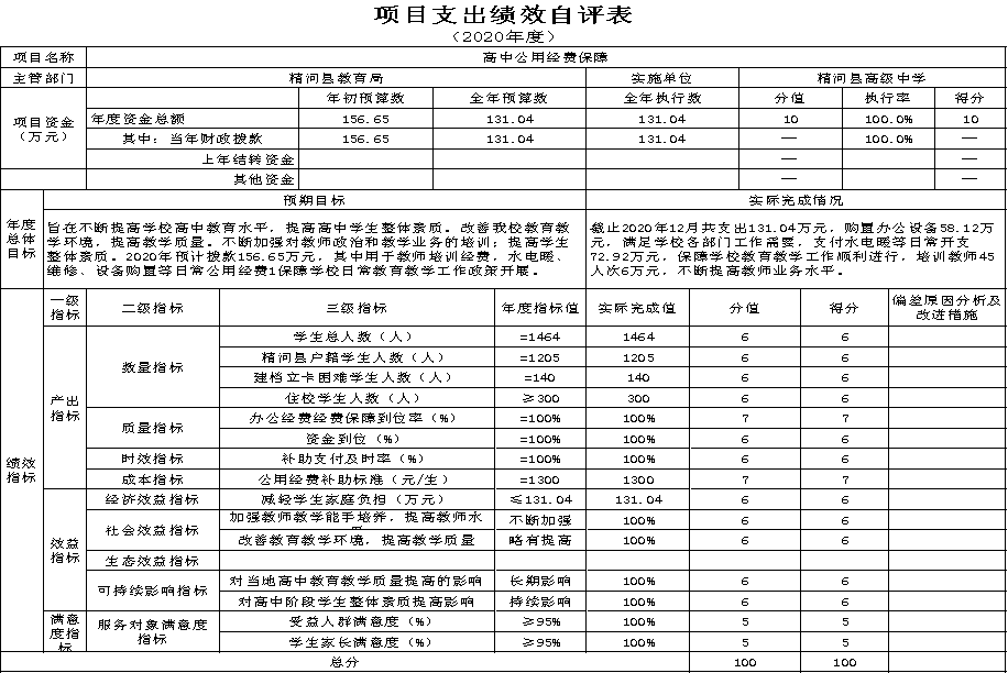 预算绩效管理取得的成效:一是初步树立绩效理念。通过开展绩效评价,我单位领导开始转变观念,重视财政支出绩效问题,由重资金争取重过程管理,向重支出责任,重产出和结果转变,以提高资金使用绩效为目标,以结果为导向的管理理念正在逐步形成;二是强化了责任意识。通过设立明确可衡量的绩效目标,单位各部门更清楚的了解项目资金所要取得的社会和经济效益,使各部门的职能和目标得到进一步明确,在一定程度上强化了单位整体和各部门的自我约束意识和责任意识;三是增强了资金管理的科学性,对预算资金支出的科学性、效益性和管理水平的评价,对绩效评价结果的运用,有利于促进各部门不断完善内部管理,自觉加强对各项预算资金的管理和监督,不断增强财政资金使用、管理的科学性。四是高中免学费政策的实施,确保单位正常运转,单位业务工作正常开展。保证学生受教育的权利,使少年在品德、智力、体质等方面全面发展,按照规定标准完成教育教学任务,提高教育教学质量,促进学生全面发展;加强安全和后勤服务工作,为提高教育教学质量提供有力保障。五是普通高中国家助学金政策的实施,通过资金补助减少家庭经济困难学生的开支,保障了受资助学生的基本生活费用,有效的改善了贫困学生的生活压力,减轻经济困难学生家庭负担,确保困难学生入学率,提高我县教育质量。提高政策知晓率,使用家长和学生达到96%的满意度,让学生和家长知道感党恩,跟党走!六是通过自治州“名校工程”、“引智引才”工程的开展,扎实推进我县高中教育工作,把学校办成教育理念与办学特色鲜明、享有一定办学美誉度和社会影响力,对其他学校发展能够产生典型示范与引领作用的博州名校,为博州教育实现品质提升提供有力支撑,努力办好精河人民满意的高中教育,培养更多的优秀人才。2020年共培训教师46人次,建成标准化机房1间、录播教室1间。