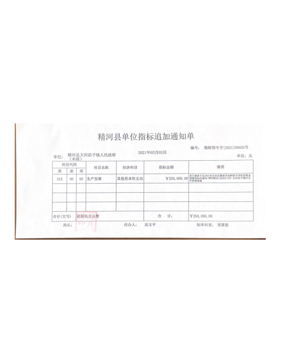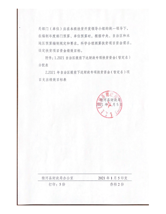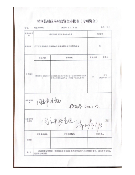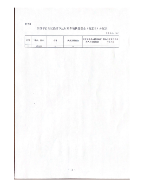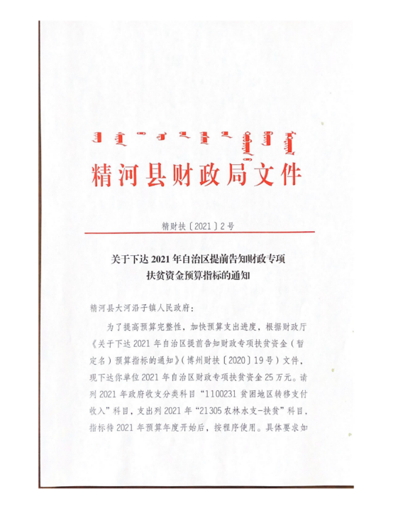 博州财政局《关于下达2021年自治区提前告知财政专项扶贫资金预算的通知》(博州财扶〔2020〕19号)文件,下达中央财政专项扶贫资金25万元。