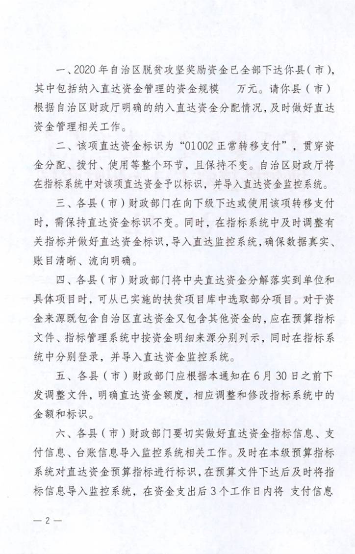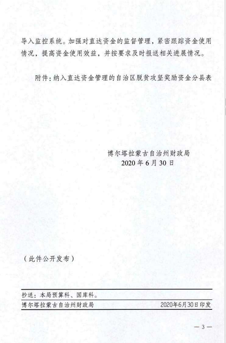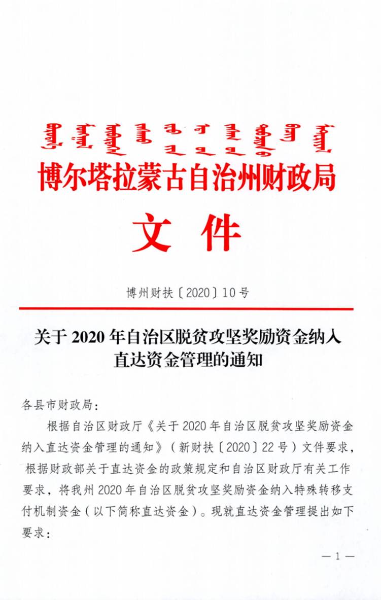 博州财政局《关于2020年自治区脱贫攻坚奖励资金纳入直达资金管理的通知》(博州财扶[2020]10号)文件下达财政专项资金为奖励金纳入直达资金管理312万元,均为扶贫发展资金。