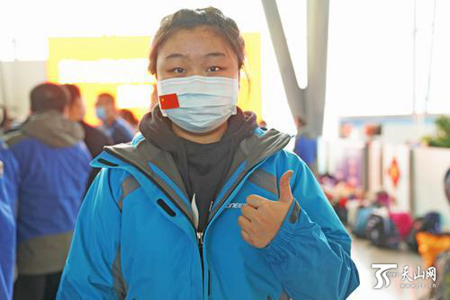 2月6日,乌鲁木齐地窝堡国际机场,新疆维吾尔自治区人民医院康复科护士郭宇婷拍照留念。