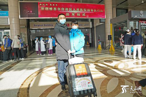 2月6日,新疆维吾尔自治区人民医院,第三批新疆支援湖北医疗队队员、重症医学科护士长王彩虹和她的丈夫蔡露华合影留念。