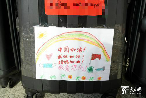 2月6日,新疆维吾尔自治区人民医院,第三批新疆支援湖北医疗队队员、新疆维吾尔自治区人民医院重症医学科护士长王彩虹的行李箱上,贴着她7岁的孩子给她画的一幅画。