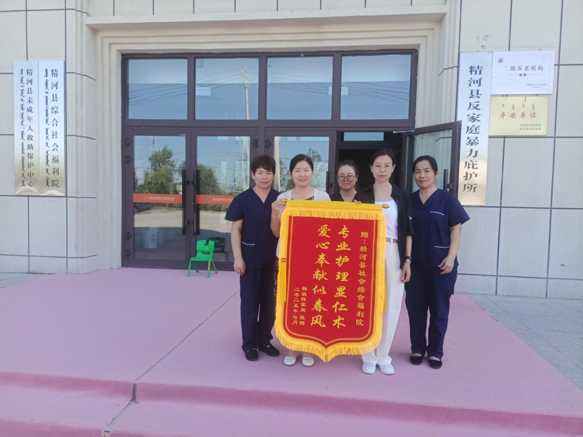 2025年6月,远在哈密的杨阿姨病情加重,在精河县工作的子女也无法赴哈密长期照顾陪伴,年迈的父亲一个人照顾更是困难,子女们商量后把杨阿姨送到了家门口的精河县社会综合福利院。杨阿姨家属在赠送锦旗时,眼含热泪说到:“我妈妈在人生最后的旅途中,得到了比我们家人还要细致入微的照顾,每一次探望,都能感受到她发自内心的笑容和对这里的依恋,感谢你们给予了她最舒适的晚年生活,虽然母亲已离我们而去,但你们给予她的温暖与关爱,我们铭记在心中。”