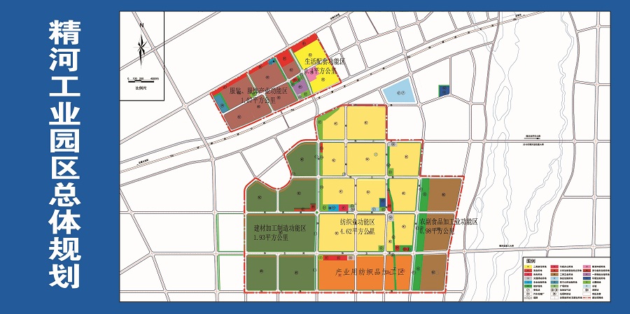 2014年,精河工业园区纳入自治区纺织服装产业带动就业“三城七园一中心”七园之一;2016年,被自治区定位为“全疆产业用纺织品主要产业区”。2017年2月,自治区人民政府批准精河工业园区总体规划(2016—2030年)(新政函〔2017〕155号),园区设定五大产业发展功能区:纺织产业功能区4.62平方公里;建材制造加工产业功能区1.93平方公里;服饰、服装产业功能区1.07平方公里;农副食品加工功能区0.98平方公里;盐化工产业功能区0.9平方公里;生活配套区0.4平方公里。