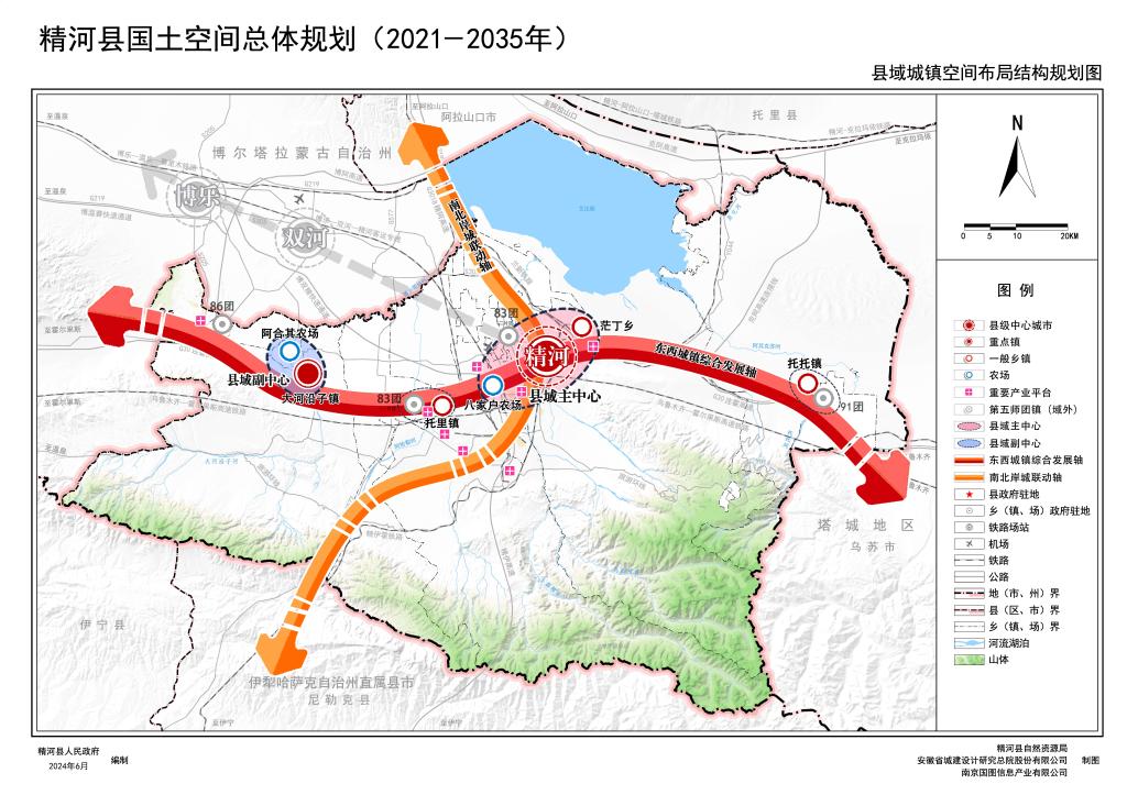 立足“南山北湖、东漠西田”自然地理格局特征,衔接落实博州“一屏两湖一绿洲,一核两翼三轴带”的州域国土空间总体格局,按照生产空间集约高效、生活空间宜居适度、生态空间山清水秀的原则,以资源环境承载能力和国土空间开发适宜性为基础,以“精八茫”一体化发展核作为县域主中心,统筹农业空间、生态空间、城镇空间,按照“中心引领、山湖相映、两轴联动、两区协同”的结构思路,构建“一核两轴、两带两区”的县域国土空间总体格局。