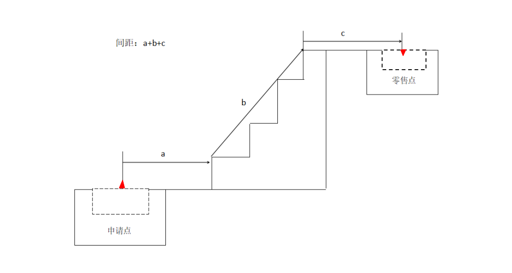 5.申请人的经营场所与最近零售点的经营场所之间有台阶、楼梯的,以其平面坡长进行测量(图5所示);有电梯的,以层高进行测量;楼梯与电梯并存的,以最短距离为准。