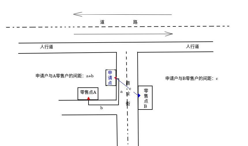 4.申请人的经营场所网格属性为商业街,测量与最近零售点的经营场所的间距,①存在有转角的(零售点A)按直角分段测量最短距离;②对面(零售点B)按可通行的最短路径进行测量。(图4所示)