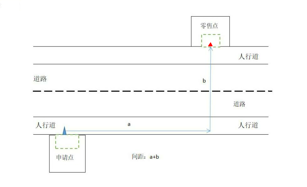 1.申请人的经营场所与最近零售点的经营场所同侧无障碍物的,测量最短直线距离。(图1所示)