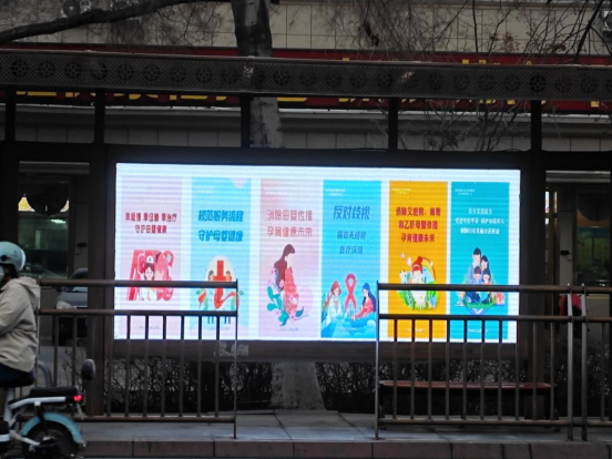 为扎实推进消除艾滋病、梅毒和乙肝(以下简称“艾梅乙”)母婴传播工作,筑牢母婴健康防护网,精河县秉持创新理念,充分挖掘城市公共空间传播潜力,构建“动态+静态”“流动+定点”的多维宣传矩阵,全力提升群众对“艾梅乙”母婴传播的认知,增强大家的自我保健意识。通过多平台宣传,极大拓宽了宣传覆盖面,形成了强大的宣传矩阵。公交站台上的宣传海报十分醒目,海报上清晰展示了“艾梅乙”母婴传播的危害,预防措施以及早检测、早发现、早治疗的重要性,以及反歧视等相关内容。简洁易懂的文字、生动形象的配图,过往行人的目光很容易就被吸引。友好时代广场的大屏持续滚动播放消除“艾梅乙”母婴传播的科普视频。通过通俗易懂的语言,生动形象的画面,让群众清晰认识到母婴传播的危害,以及阻断干预的紧迫性和重要性,吸引了大批群众驻足观看。出租车LED屏幕上不断滚动播放“消除艾滋病、梅毒和乙肝母婴传播”等宣传标语,使出租车成为流动的宣传“小喇叭”,穿梭在城市大街小巷,将宣传信息传递到各个角落,进一步扩大了宣传影响力。