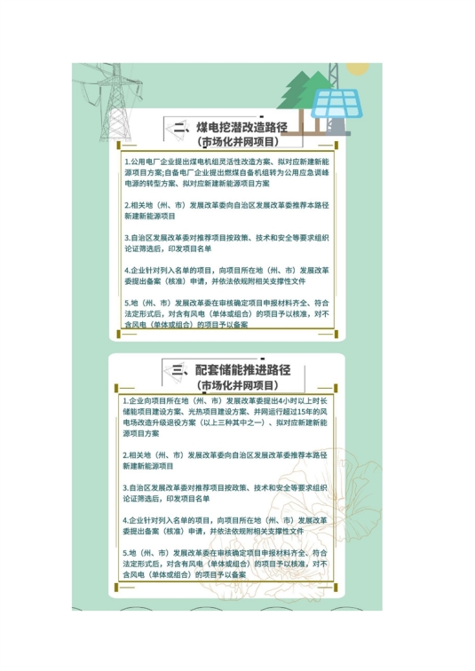 温馨提示:通过煤电挖潜改造路径建设新能源项目的,投资主体应为实施煤电机组灵活性改造、自备机组转为公用应急调峰电源的企业,不得转让新能源建设规模。申报配建新能源项目前,企业需提出煤电机组灵活性改造方案,自治区发展改革委结合国网年度机组检修安排,开展灵活性改造方案评估,印发煤电机组灵活性改造计划。或企业提出燃煤自备机组转为公用应急调峰电源的转型方案,明确转为公用电源的时间、电网接入方式等事项,自治区发展改革委会商国网新疆电力公司,确认转型方案。