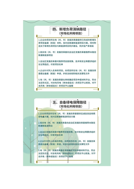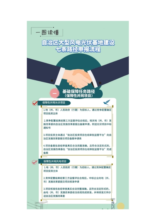 二是第(一)条路径中项目为保障性并网项目,光伏(向大电网送电)项目由自治区发展改革委备案,风电项目由地(州、市)发展改革委核准;第(二)(三)(四)(五)(六)条路径中项目,为通过源网荷储一体化、多能互补等方式建设的市场化并网项目。根据《国家发展改革委 国家能源局关于完善能源绿色低碳转型体制机制和政策措施的意见》(发改能源〔2022〕206号)中“深化能源领域‘放管服’改革,优化清洁低碳能源项目核准和备案流程”精神,自治区发展改革委经组织国家能源局新疆监管办、自治区自然资源厅、生态环境厅、国网新疆电力有限公司等相关部门和单位,按政策、技术和安全等要求论证,将符合要求的项目列入自治区项目名单后,统一由地(州、市)发展改革委核准(备案);第(七)条路径中项目为市场化并网项目,由各地(州、市)发展改革委核准(备案)。