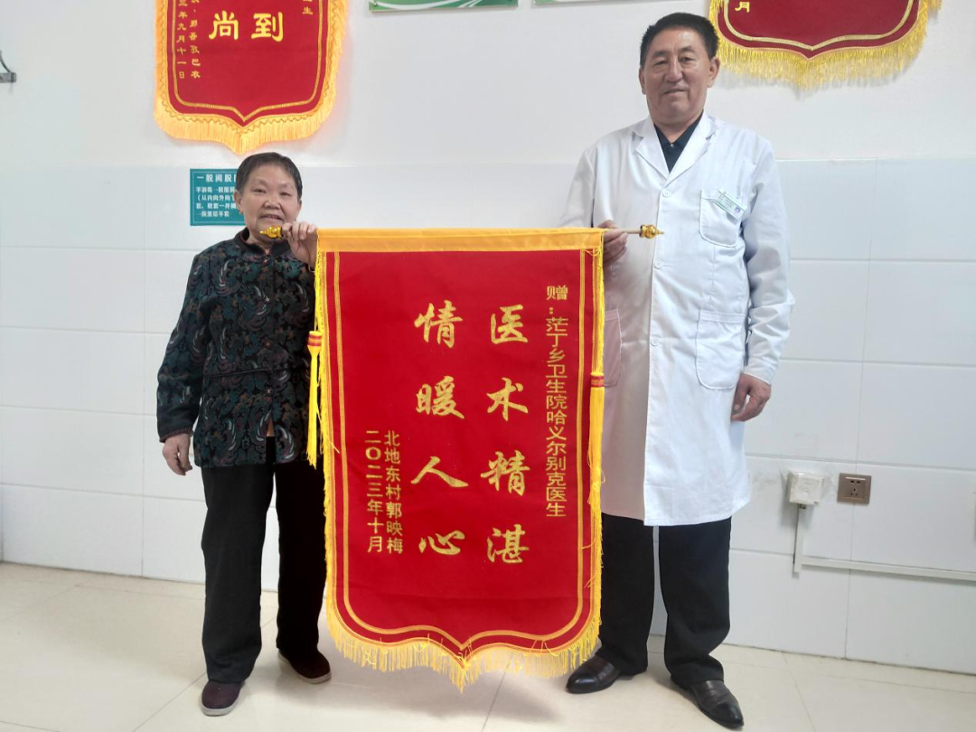 10月19日,精河县茫丁乡北地东村的患者郭女士将印有“医术精湛 情暖人心”字样的锦旗送到了茫丁乡卫生院门诊部医生手中。