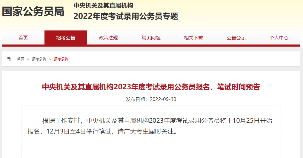 根据工作安排,中央机关及其直属机构2023年度考试录用公务员将于10月25日开始报名,12月3日至4日举行笔试,请广大考生届时关注。