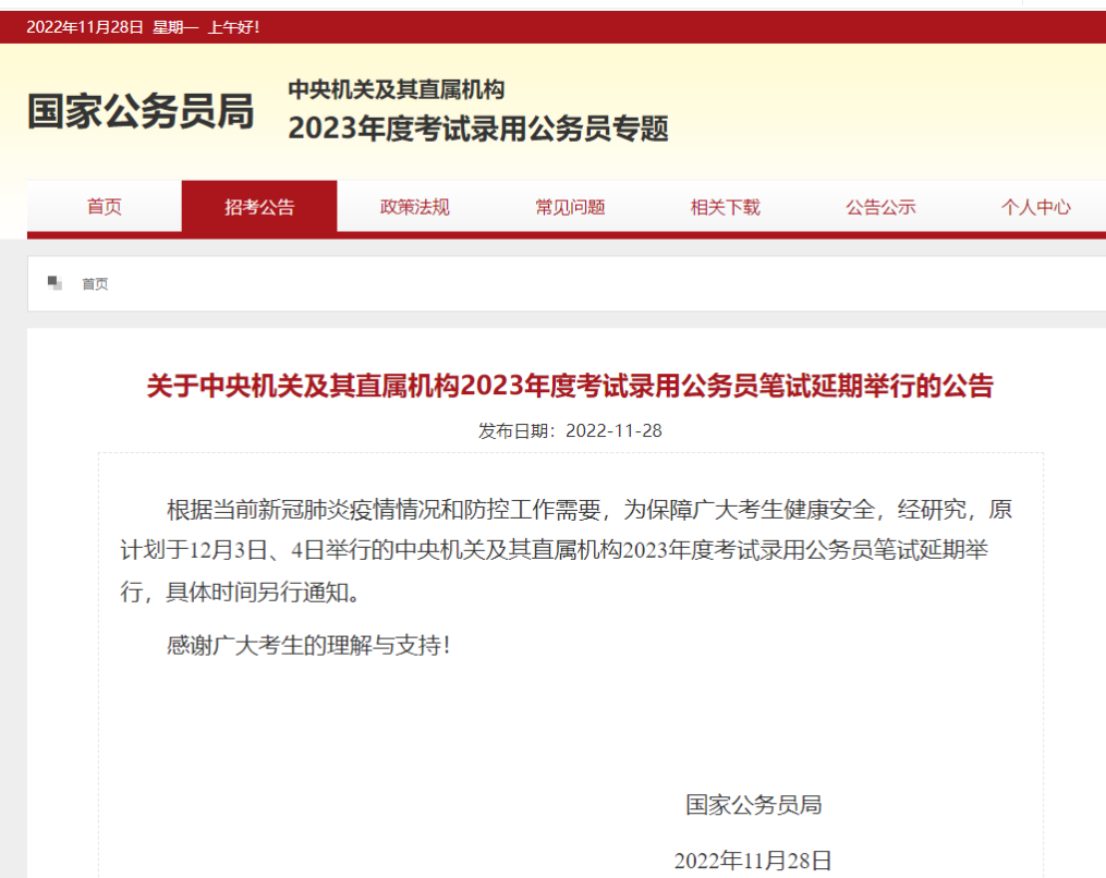 根据当前新冠肺炎疫情情况和防控工作需要,为保障广大考生健康安全,经研究,原计划于12月3日、4日举行的中央机关及其直属机构2023年度考试录用公务员笔试延期举行,具体时间另行通知。
