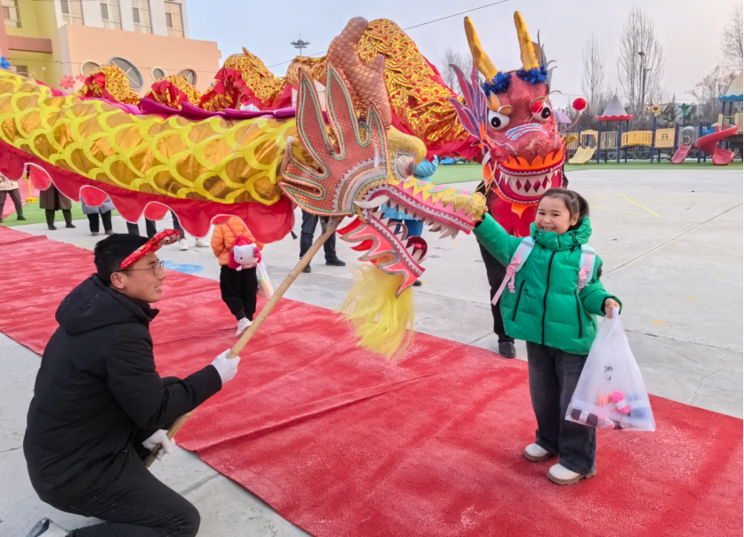 在清晨第一缕阳光下,威武的福龙在第四幼儿园喜迎孩子们回园……“摸摸龙头,万事不愁!摸摸龙背,好运加倍!摸摸龙尾,顺风顺水”!孩子们满心欢喜流露出欢聚的笑容。各班老师们还准备了有趣的年俗小游戏,形式多样的开学第一课,孩子们在欢快的音乐中体验解锁不同的传统文化游戏!