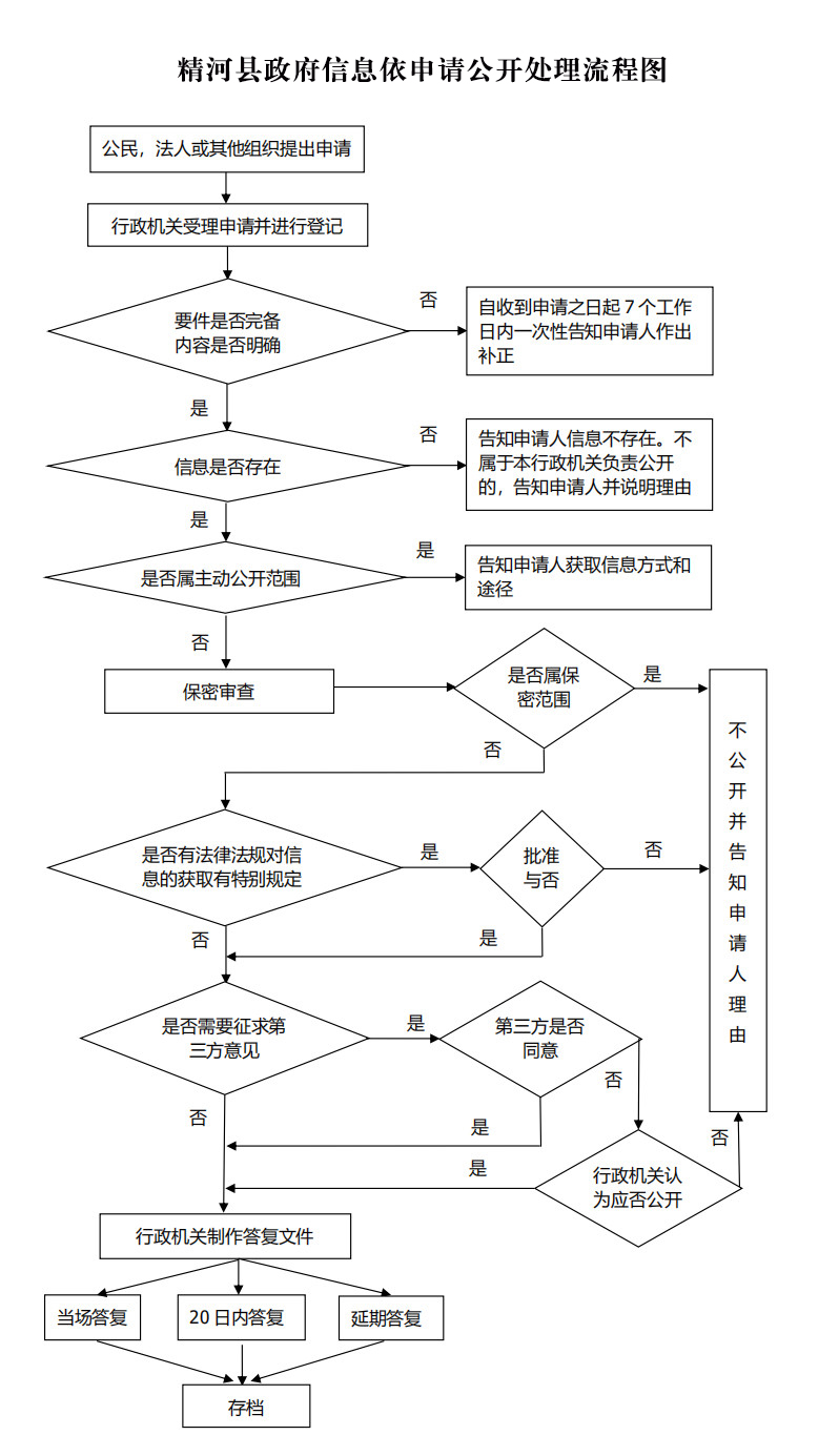 公民、法人或者其他组织(以下简称申请人)可申请精河县人民政府主动公开以外的政府信息。本机关在公开政府信息前,将依照《中华人民共和国保守国家秘密法》以及其他法律、法规和国家有关规定对拟公开的政府信息进行审查。 精河县人民政府提供政府信息时除区分处理外,根据现有政府信息的实际物理状态提供,不承担对政府信息进行加工、分析的义务。 凡涉及党委、政府联合发文的信息,严格按照《中国共产党党务公开条例(试行)》规定执行。 (一)受理机构 受理机构:精河县政务服务和大数据发展服务中心 工作时间:周一至周五(夏季)10:00—14:00,16:00—20:00;(冬季)10:00—14:00,15:30—19:30(节假日除外)。 联系地址:精河县伊犁路7号 联系电话:0909-5328009 传真号码:0909-5332140 (二)申请所需材料 申请人提出的政府信息公开申请应当真实载明下列内容: 1.申请人的姓名或名称、有效身份证明、联系方式。 2.申请公开的政府信息的名称、文号或者便于行政机关查询的其他特征性描述。所需的政府信息应当描述明确、详尽,有助于受理机构确定信息内容。 3.申请公开的政府信息的形式要求,包括获取信息的方式、途径。 申请人向本机关提交政府信息公开申请,应当同时上传或提供身份证明。 (三)申请方式 申请人填写《精河县人民政府政府信息公开申请表》(以下简称《申请表》,申请表可以在精河县人民政府门户网站政府信息公开专栏的政府信息公开指南或依申请公开栏目下载打印,申请表复印有效。 申请人向本机关获取政府信息的,可采取以下方式提出申请: 1.当面提交 地址:精河县伊犁路7号党政综合楼1号楼211室(精河县政务服务和大数据发展服务中心) 工作时间:周一至周五(夏季)10:00—14:00,16:00—20:00;(冬季)10:00—14:00,15:30—19:30(节假日除外)。 联系电话:0909-5328009 2.信函申请 收件人名称:精河县政务服务和大数据发展服务中心 通信地址:精河县伊犁路7号党政综合楼1号楼211室 联系电话:0909-5328009 邮编:833300 其他:本机关只接收中国邮政寄件,来信请在信封显著位置注明“政府信息公开申请”字样。 3.网络申请 申请人通过网络申请方式进行申请的,应填写《申请表》并通过电子邮箱(jhdzzwb@sina.cn)发送,发送邮箱后请致电0909-5328009进行确认。 (四)申请处理 1.答复时限 本机关收到政府信息公开申请后,予以登记。除可以当场答复的外,自收到申请之日起20个工作日内予以答复;如需延长答复期限的,经本机关政府信息公开工作机构负责人同意并告知申请人,延长答复的期限最长不超过20个工作日。 2.答复情形 (1)属于已经主动公开的,告知申请人获取该政府信息的方式和途径; (2)属于可以公开的,向申请人提供该政府信息,或者告知申请人获取该政府信息的方式、途径和时间; (3)属于不予公开范围的,告知申请人并说明理由; (4)经检索没有所申请公开信息的,告知申请人该政府信息不存在; (5)申请的政府信息不属于本行政机关负责公开的,告知申请人并说明理由;如能确定负责公开该政府信息的行政机关的,告知申请人该行政机关的名称、联系方式; (6)行政机关已就申请人提出的政府信息公开申请作出答复、申请人重复申请公开相同政府信息的,告知申请人不予重复处理; (7)申请公开信息属于工商、不动产登记资料等信息,有关法律、行政法规对信息的获取有特别规定的,告知申请人依照有关法律、行政法规的规定办理。 (五)申请注意事项 1.申请人委托代理人提出政府信息公开申请的,应当提供委托代理证明材料。 2.政府信息公开申请内容不明确的,本机关告知申请人作出补正,说明需要补正的事项和合理的补正期限。申请人无正当理由逾期不补正的,视为放弃申请,本机关不再处理该政府信息公开申请。 3.申请人以政府信息公开申请的形式进行信访、投诉、举报等活动,本机关将告知申请人不作为政府信息公开申请处理并告知通过相应渠道提出。 4.本行政机关依申请提供政府信息,不收取费用。但是,申请人申请公开政府信息的数量、频次明显超过合理范围的,本行政机关可以按照《国务院办公厅关于印发〈政府信息公开信息处理费管理办法〉的通知》(国办函〔2020〕109号)有关规定收取信息处理费。